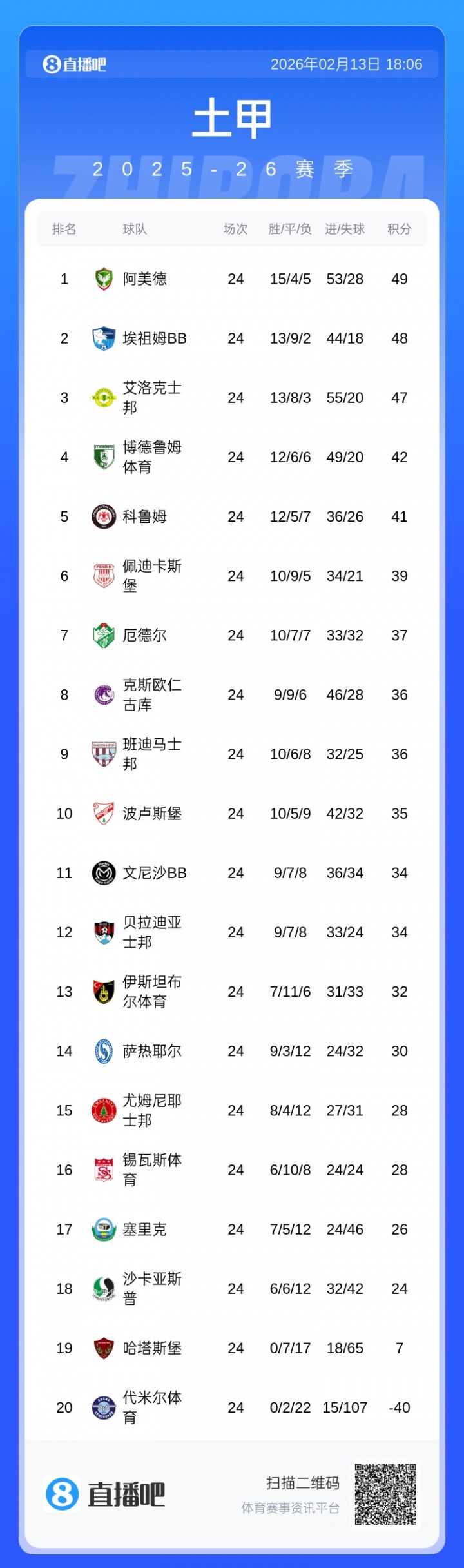 代米尔体育24轮2平22负,打进15球丢掉107球,以-40分稳居土甲垫底,新赛季将降入土乙联赛。